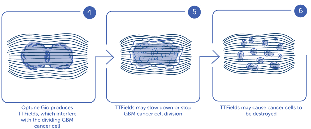 Optune Gio may help slow down or stop cancer cells from dividing, destroying some cancer cells completely.