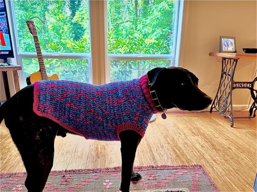 Sweaters are a big staple in Louie’s life. Other than that, he just rolls around in the grass and goes on walks. He’s blind, but it doesn’t seem to affect him much. He can still chase sticks, so he’s happy as can be.