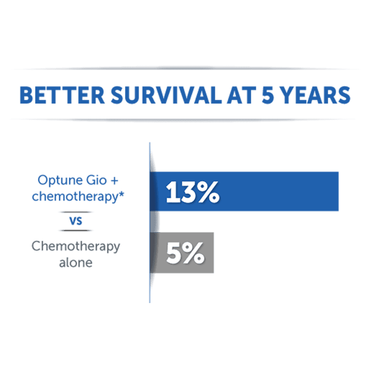 13% of people using Optune Gio + chemotherapy were alive compared with 5% of people using chemotherapy alone.